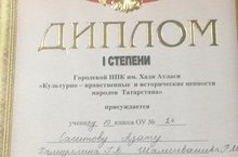 Поздравляем Сагитова Азата с победой на Городском НПК им. Хади Атласи "Культурно - нравственные и исторические ценности народов Татарстана" (науч.рук. Халиуллина Г.А. и Шамсивалиева Р.М.). Молодец!