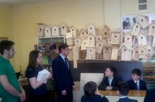 Сегодня сотрудники Министерства экологии и природных ресурсов РТ и активист молодежной экологической общественной организации "Будет чисто" посетили урок технологии. Вот уже второй год ребята под руководством учителя технологии Максимова А.А. мастерят скворечники, которые в дальнейшем передаются в лесничества Республики Татарстан. Прошла беседа о сохранности окружающей среды, а также ребята получили возможность поучаствовать в республиканском конкурсе "Школьный экопатруль".