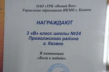 Поздравляем 3В класс ( классный руководитель Магсумова С.А.) за участие в городском проекте «Классный марафон», получившим Диплом ОАО «ТРК Новый век» и Управления образования в номинации «Воля к победе».