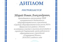 Педагог – организатор ОБЖ школы №24 Шарай Роман Александрович награжден дипломом отдела Управления образования Исполнительного комитета муниципального образования г.Казани по Вахитовскому и Приволжскому районам за активное участие и высокие результаты в городской спартакиаде среди работников образовательных учреждений «Спортивная Казань». Поздравляем!