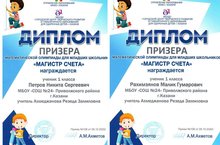 Ученики 1Б класса Петров Никита и Рахимзянов Малик (учитель Ахмеджанова Р.З.), стали ПРИЗЁРАМИ математической олимпиады для младших школьников «Магистр счёта». Молодцы! Так держать!