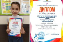 Гатауллина Эмилия, ученица 3Б класса (учитель Ахмеджанова Р.З.), стала ПОБЕДИТЕЛЕМ в Республиканской олимпиаде для младших школьников "Умка" по окружающему миру. Умничка ! Желаем новых побед!