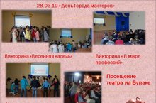 28 марта участники лагеря в рамках "День города мастеров" принимали участие в викторине "Весенняя капель", провели в отрядах "Игры народов мира", а также посетили молодежный Театр на Булаке.