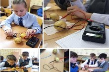 Сегодня на уроке был рассмотрен способ получения электричества из различных продуктов, в частности из картофеля. Картофель здесь исполняет роль контейнера для электролита (кислотно-солевой раствор), а с помощью двух электродов (медный и цинковый) учащиеся смогли запустить окислительно — восстановительную реакцию, в результате которой возникло небольшое напряжение, порядка 0,8 В. А если последовательно соединить 2 или 3 картошки, то можно получить еще больше электричества!