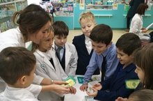 «Юный фармацевт» — это почти настоящая аптека: витрины и прилавки с забавными «лекарствами», своя денежная единица и касса. Перед игрой дети получают значок и надевают халаты.