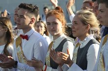 После вручения аттестатов школьники выпустили в небо голубей, а потом перед сценой 150 танцевальных пар исполнили вальс.