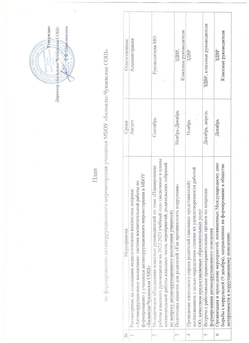 План по формированию антикоррупционного мировоззрения учащихся МБОУ Балыклы-Чукаевская СОШ