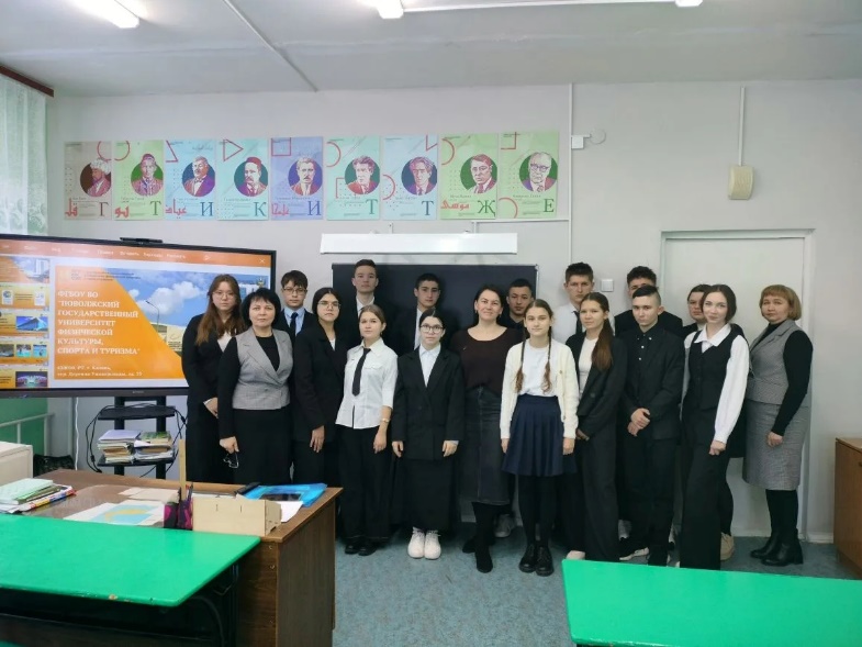 19 января состоялась встреча по профориентационному направлению с кандидатом педагогических наук, доцентом кафедры иностранных языков и языкознания Поволжского государственного университета физической культуры, спорта и туризма Гариповой Алией Накифовной. Алия Накифовна ознакомила учащихся 9-10 классов с учебным заведением, направлениями обучения, порядком поступления в вуз и условиями проживания в общежитии.