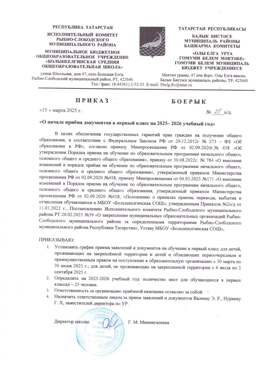 Приказ о начале приема документов в 1 класс на 2025-2026 учебный год"