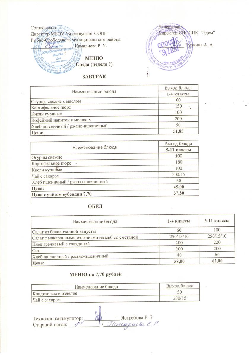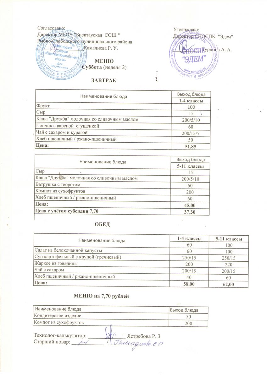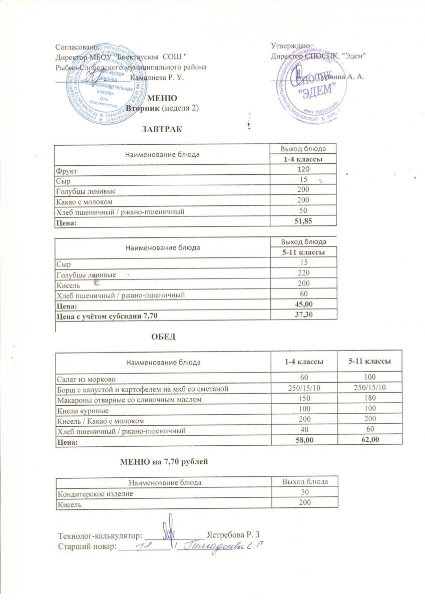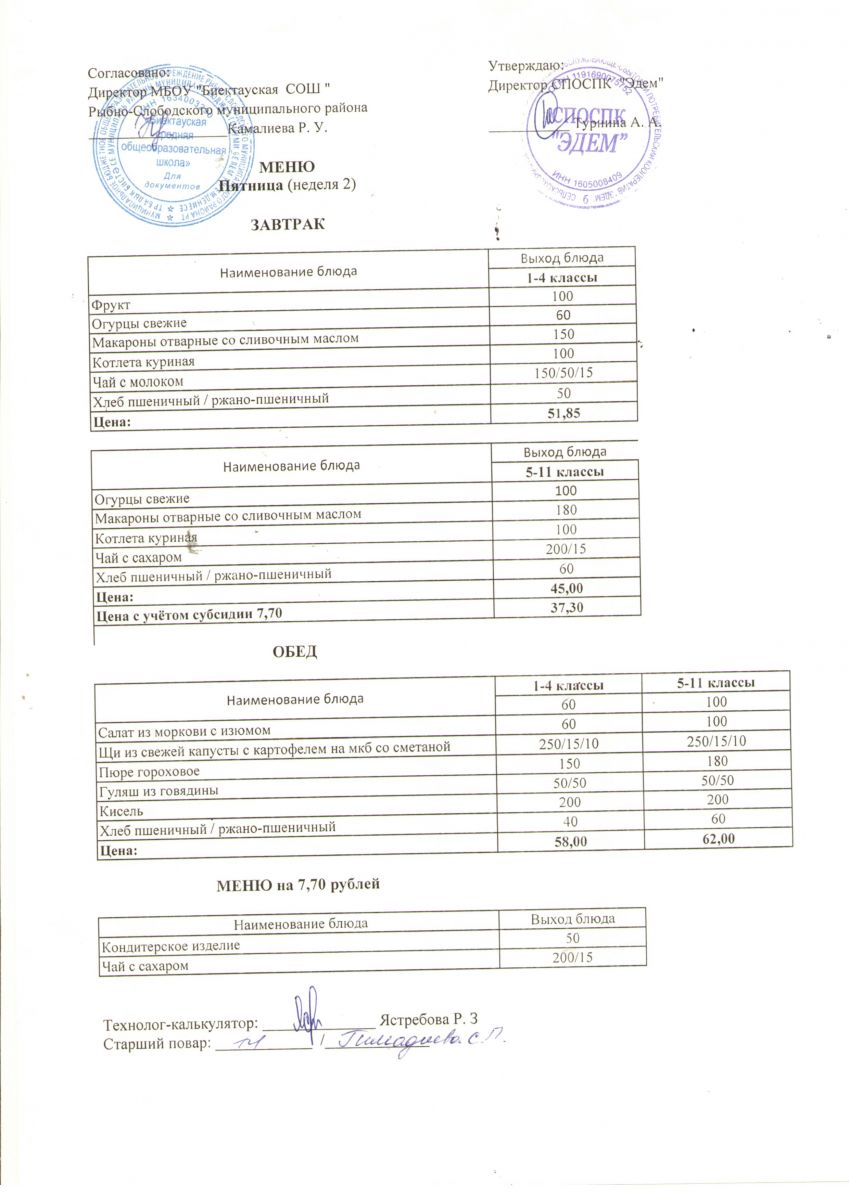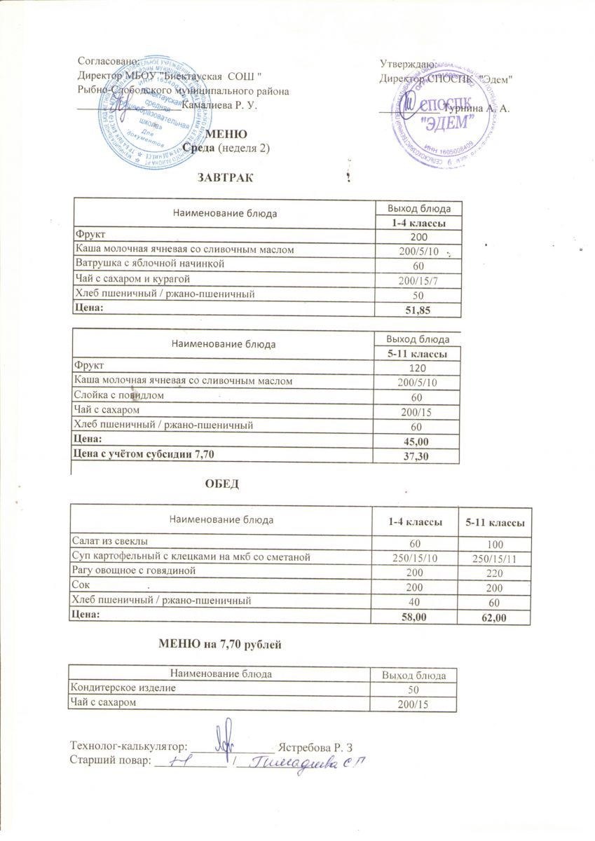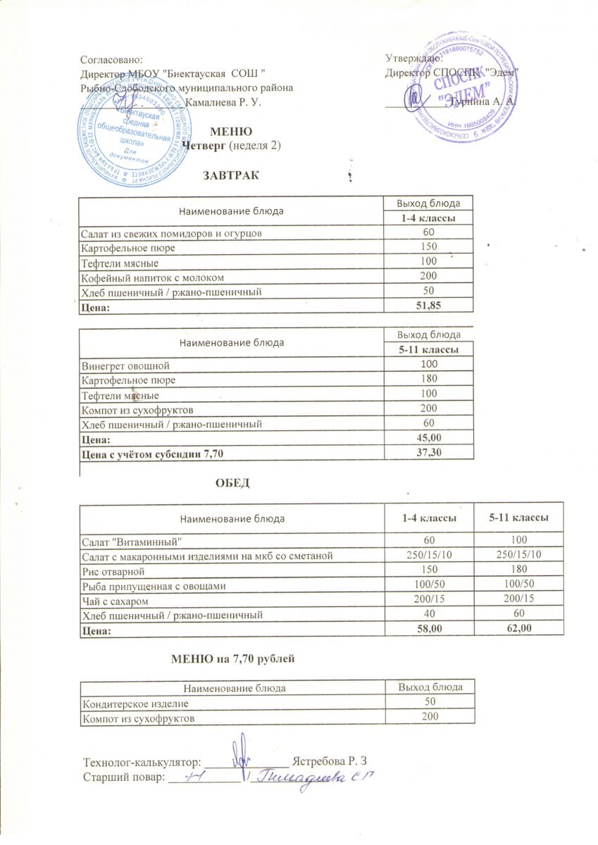 Примерное двухнедельное меню для 5-11 кл 2 полугодие
