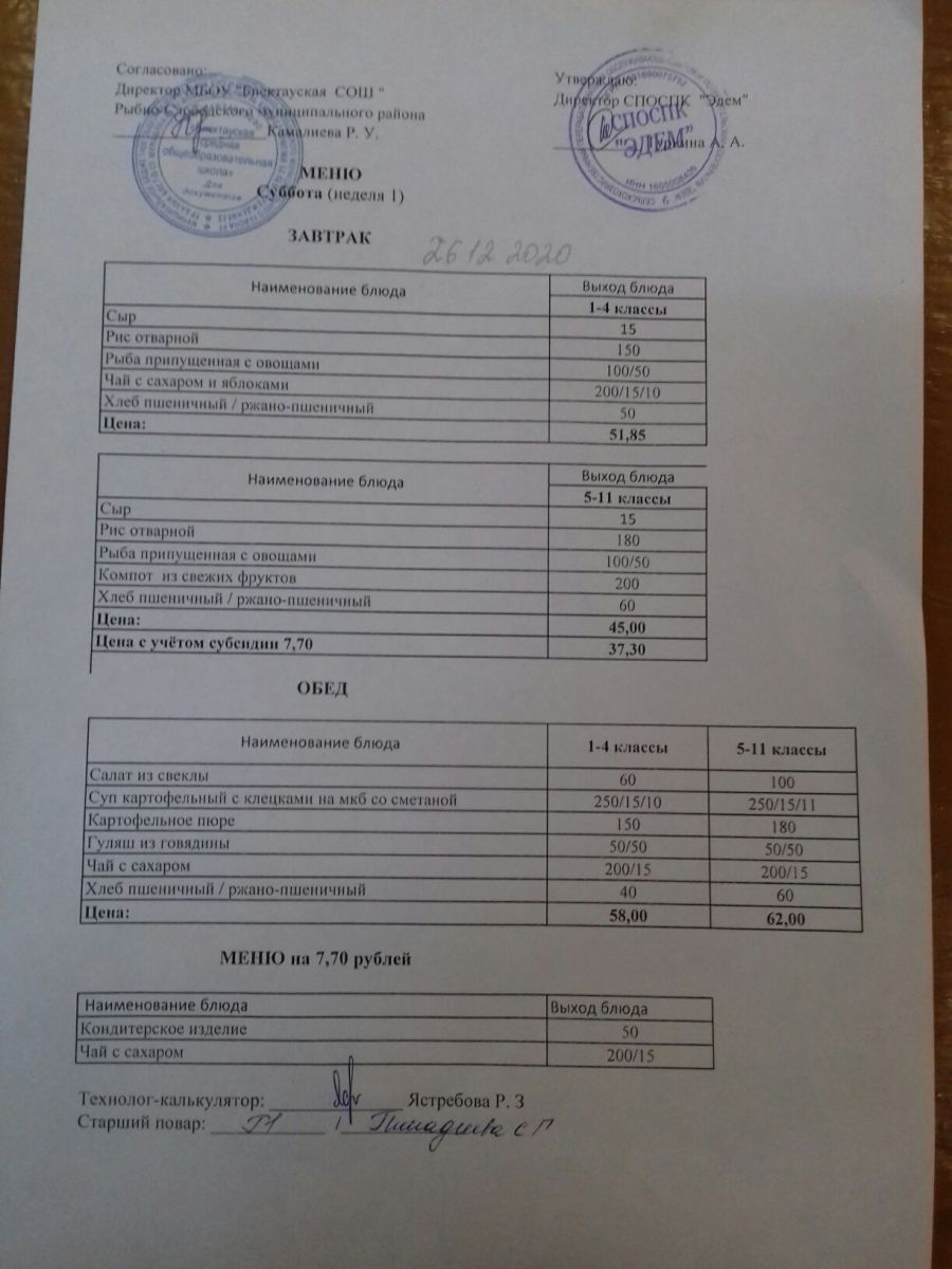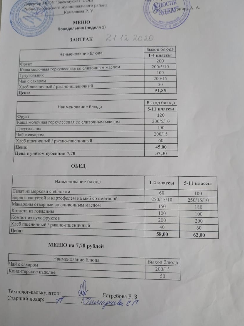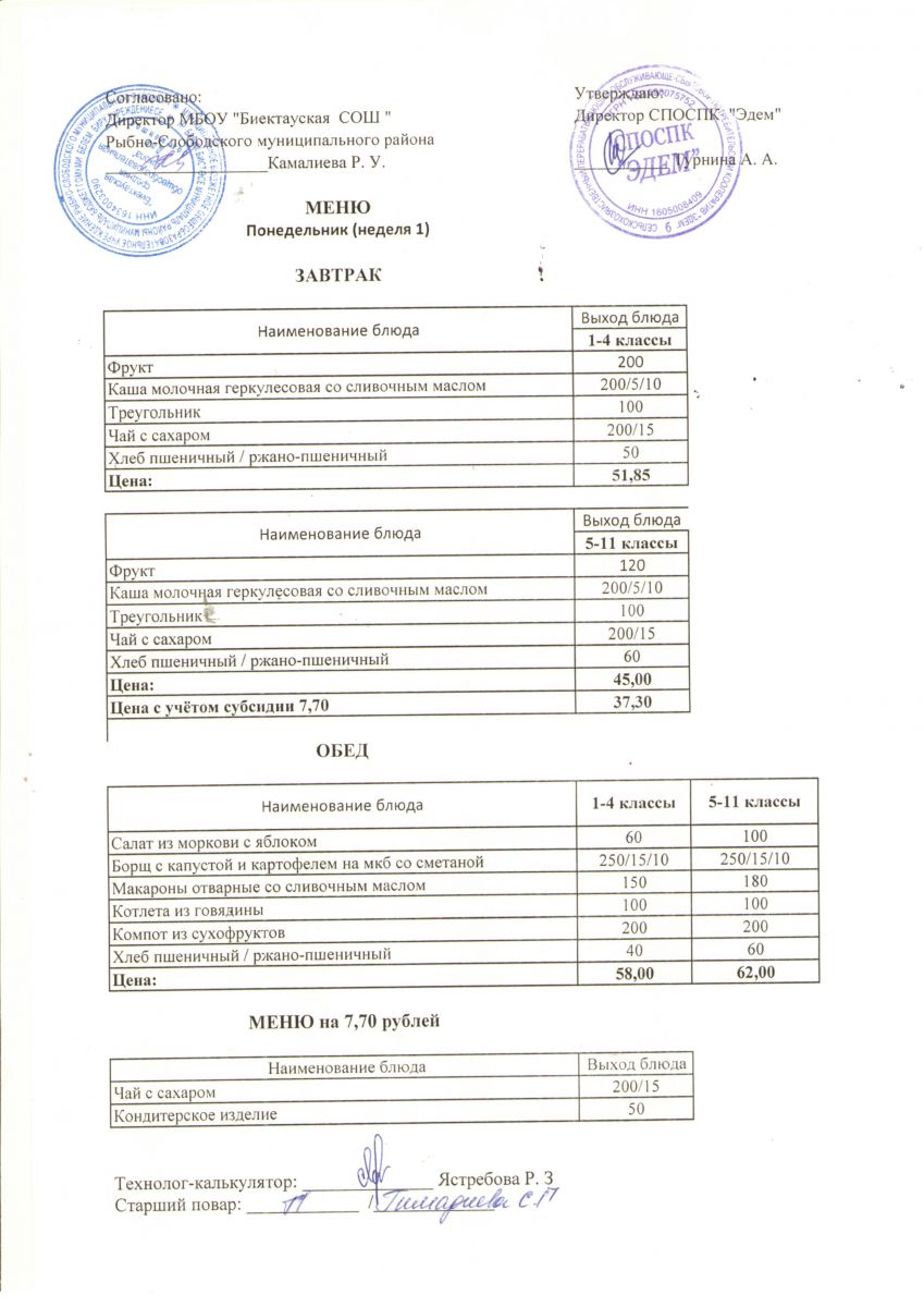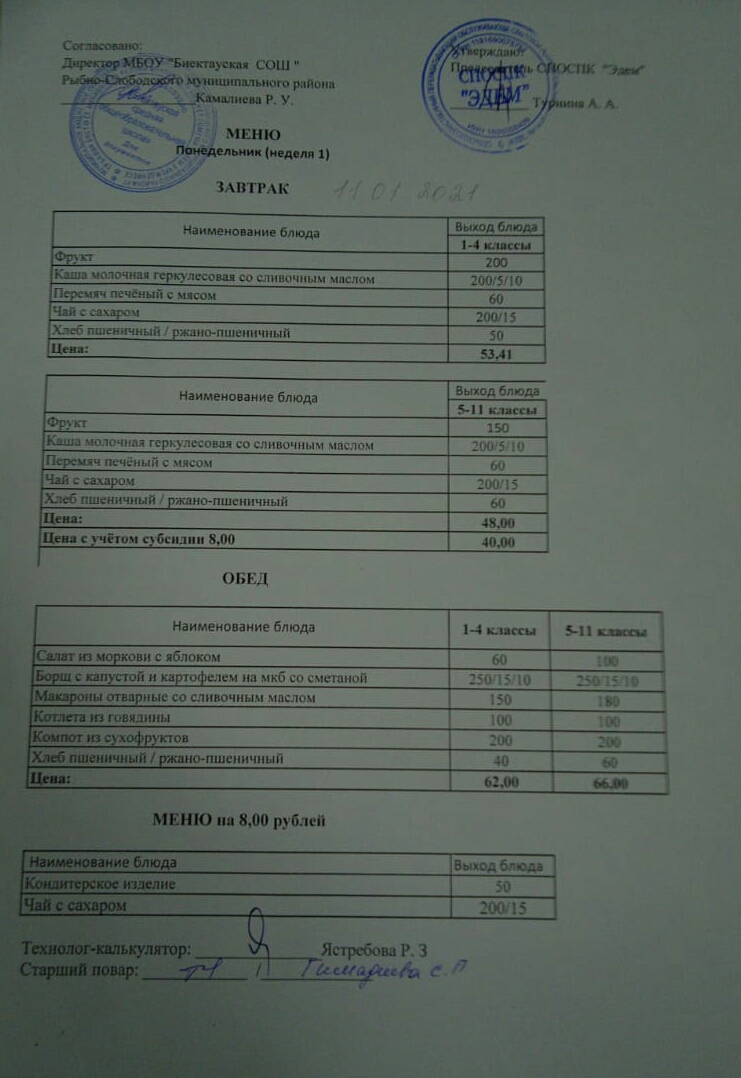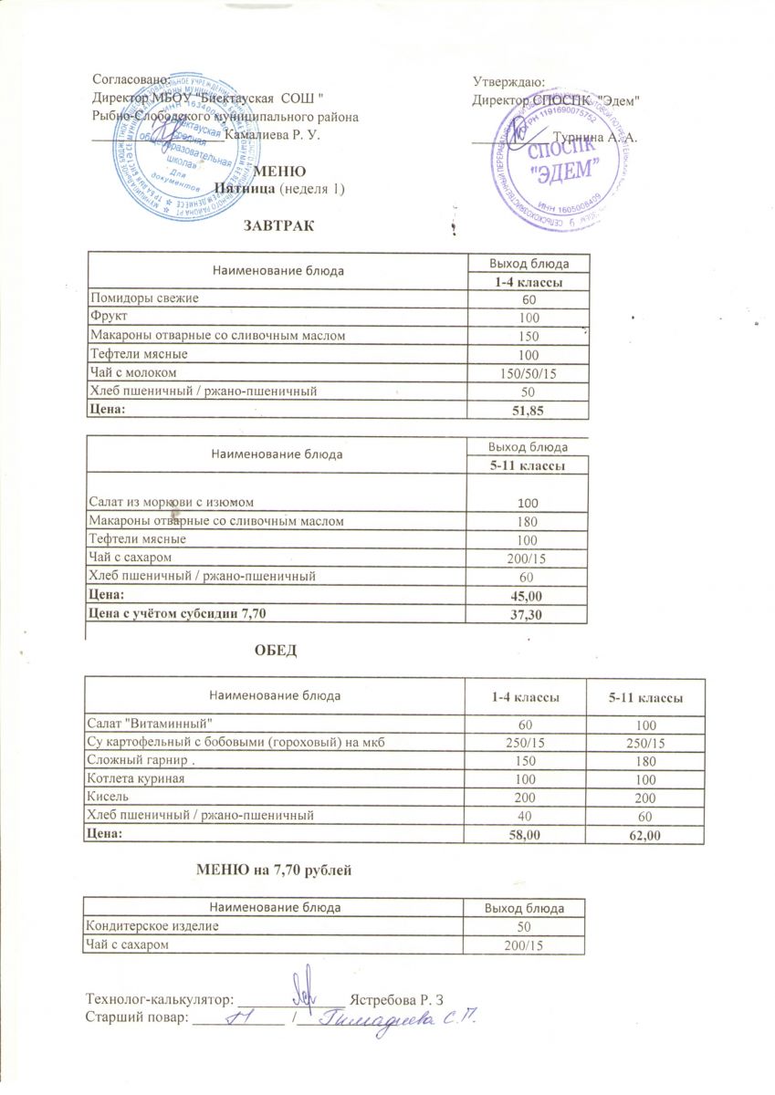 Примерное двухнедельное меню для 5-11 кл 1 полугодие
