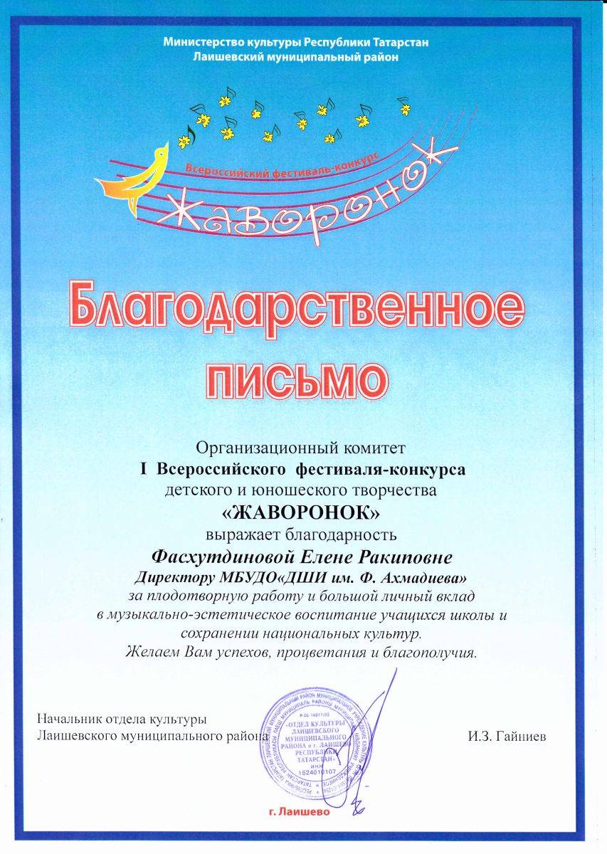 Фасхутдинова Елена Ракифовна - Благодарственное письмо Оргкомитета I-го Всероссийского фестиваля-конкурса десткого и юношеского творчества "Жаворонок" (апрель 2017г.)