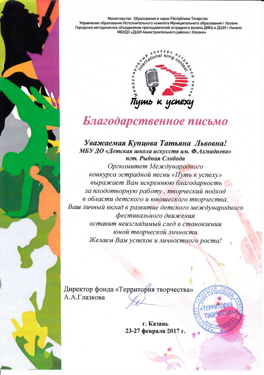 Купцова Татьяна Львовна - Благодарственное письмо международного конкурса эстрадной песни "Путь к успеху" (февраль 2017г.)