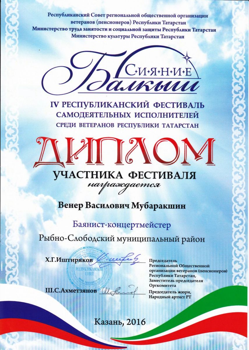Венер Василович Мубаркашин - Диплом участника IV-го республиканского фестиваля самодеятельных исполнителей "Сияние - Балкыш"