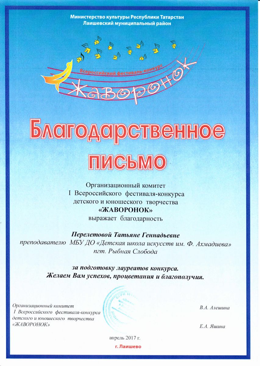 Перелетова Татьяна Геннадьевна - Благодарственное письмо Оргкомитета I-го Всероссийского фестиваля-конкурса десткого и юношеского творчества "Жаворонок" (апрель 2017г.)
