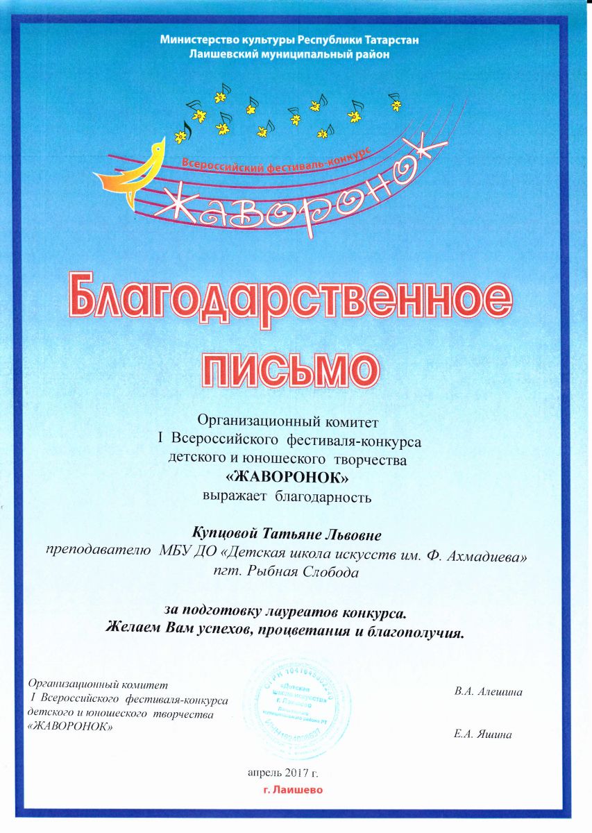 Купцова Татьяна Львовна - Благодарственное письмо Оргкомитета I-го Всероссийского фестиваля-конкурса десткого и юношеского творчества "Жаворонок" (апрель 2017г.)