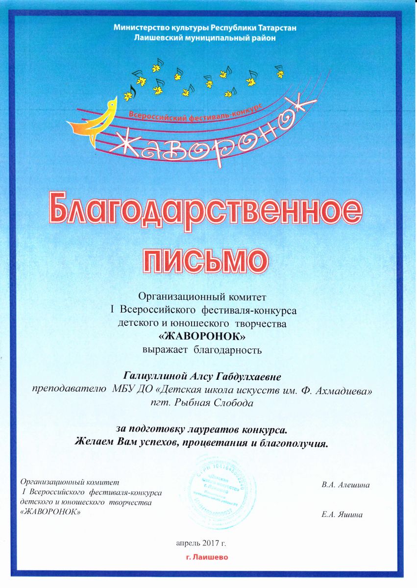 Галиуллина Алсу Габдулхаевна - Благодарственное письмо Оргкомитета I-го Всероссийского фестиваля-конкурса десткого и юношеского творчества "Жаворонок" (апрель 2017г.)