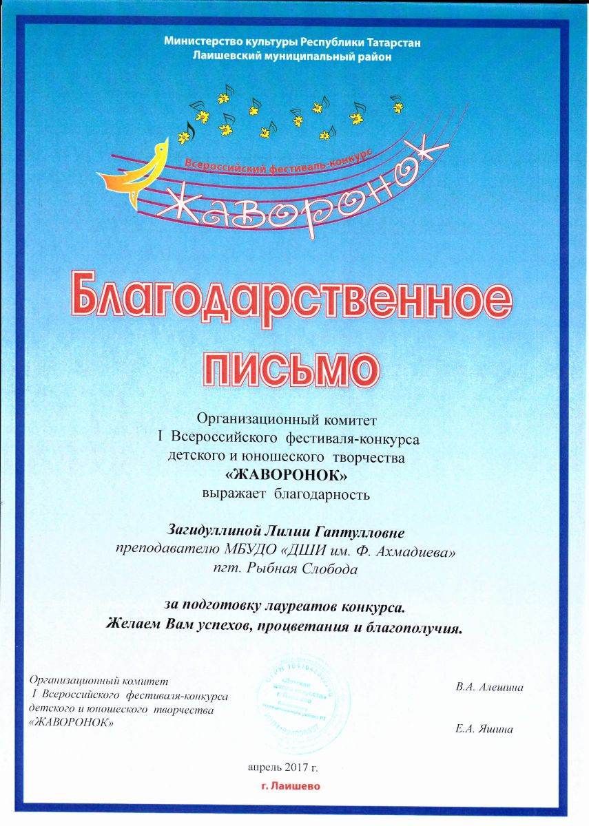 Загидуллина Лилия Гаптулловна - Благодарственное письмо Оргкомитета I-го Всероссийского фестиваля-конкурса десткого и юношеского творчества "Жаворонок" (апрель 2017г.)