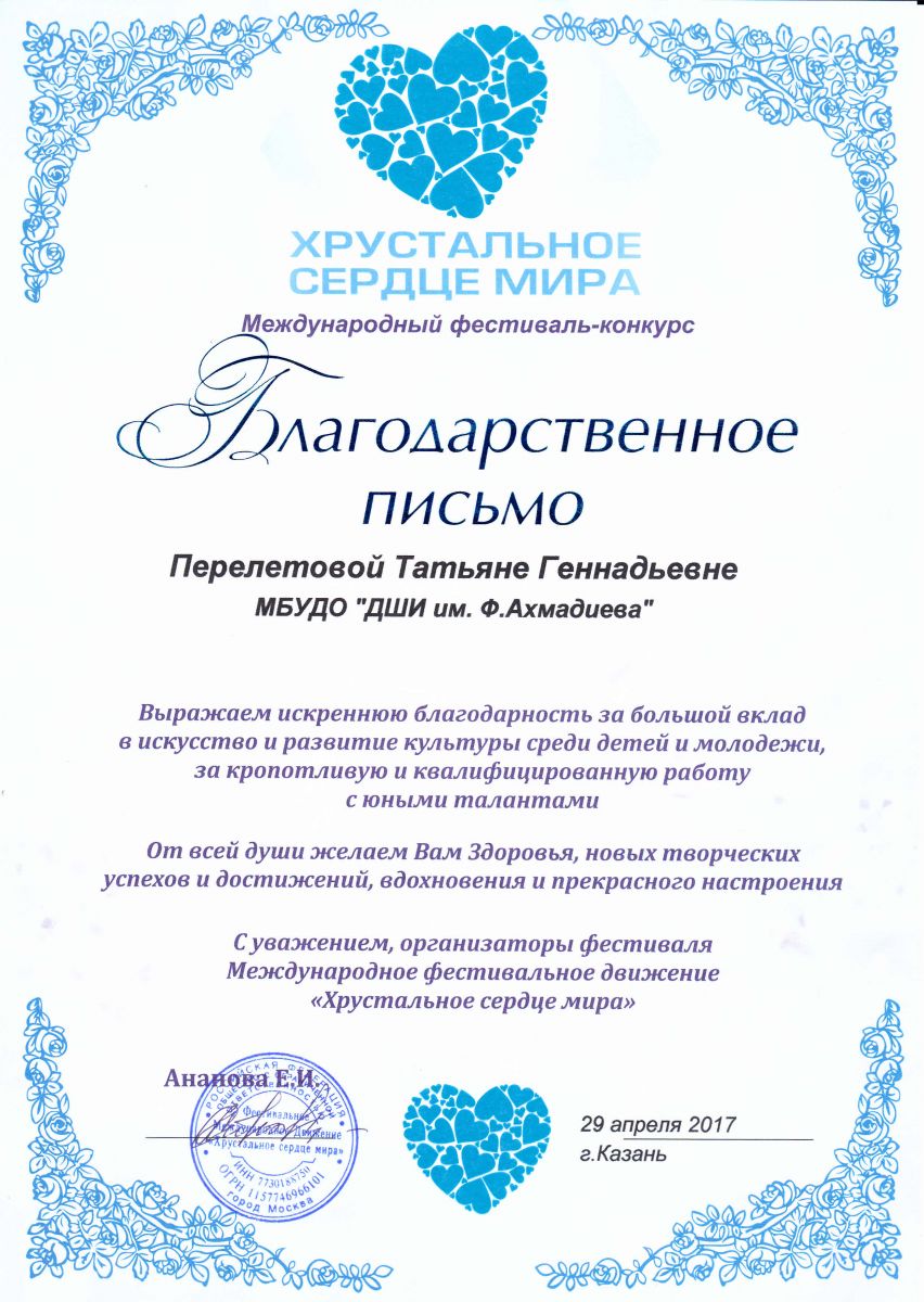 Перелётова Татьяна Геннадьевна - Благодарственное письмо Международного фестиваля-конкурса "Хрустальное сердце мира" (апрель 2017г.)