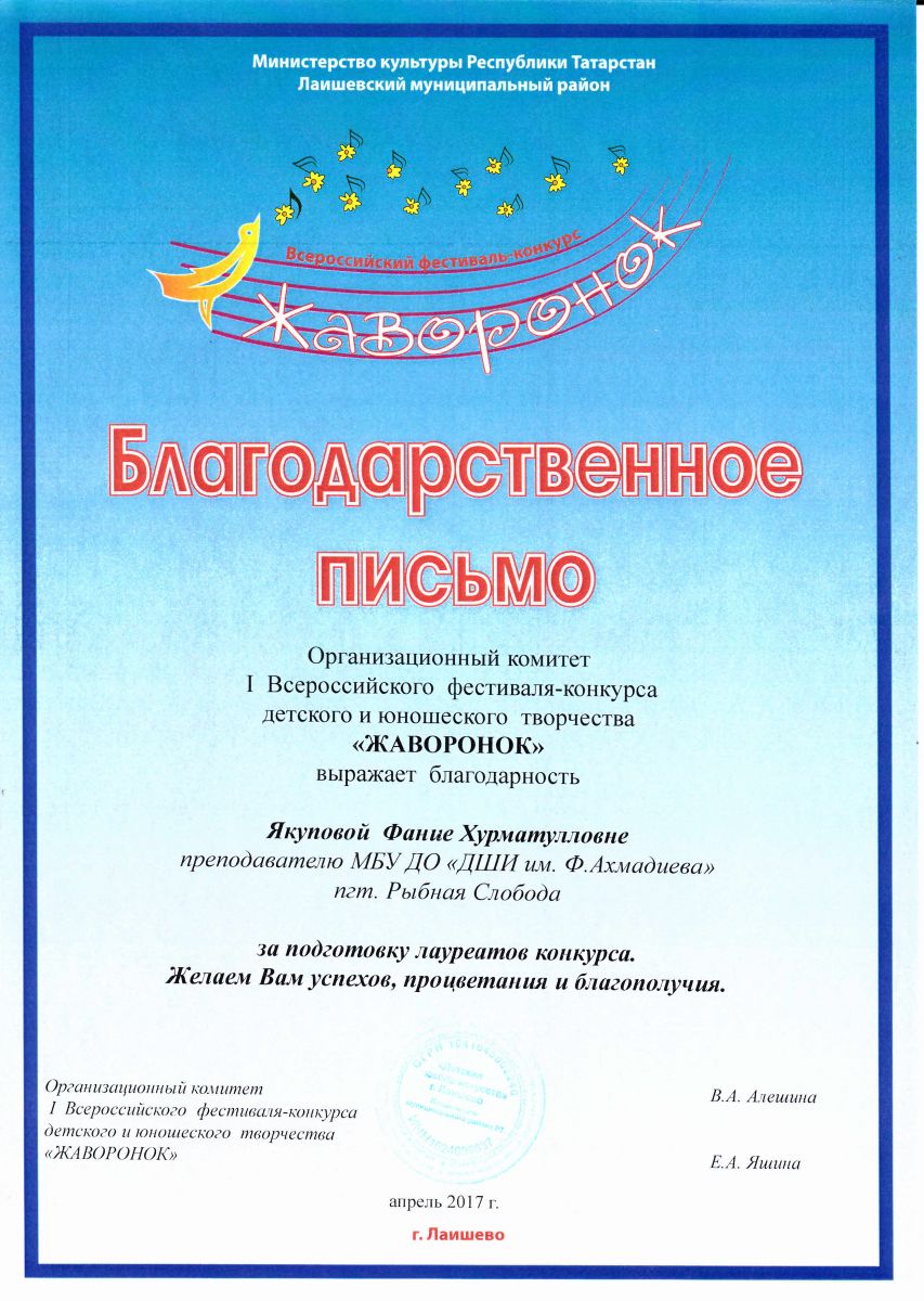 Якупова Фания Хурматулловна - Благодарственное письмо Оргкомитета I-го Всероссийского фестиваля-конкурса десткого и юношеского творчества "Жаворонок" (апрель 2017г.)