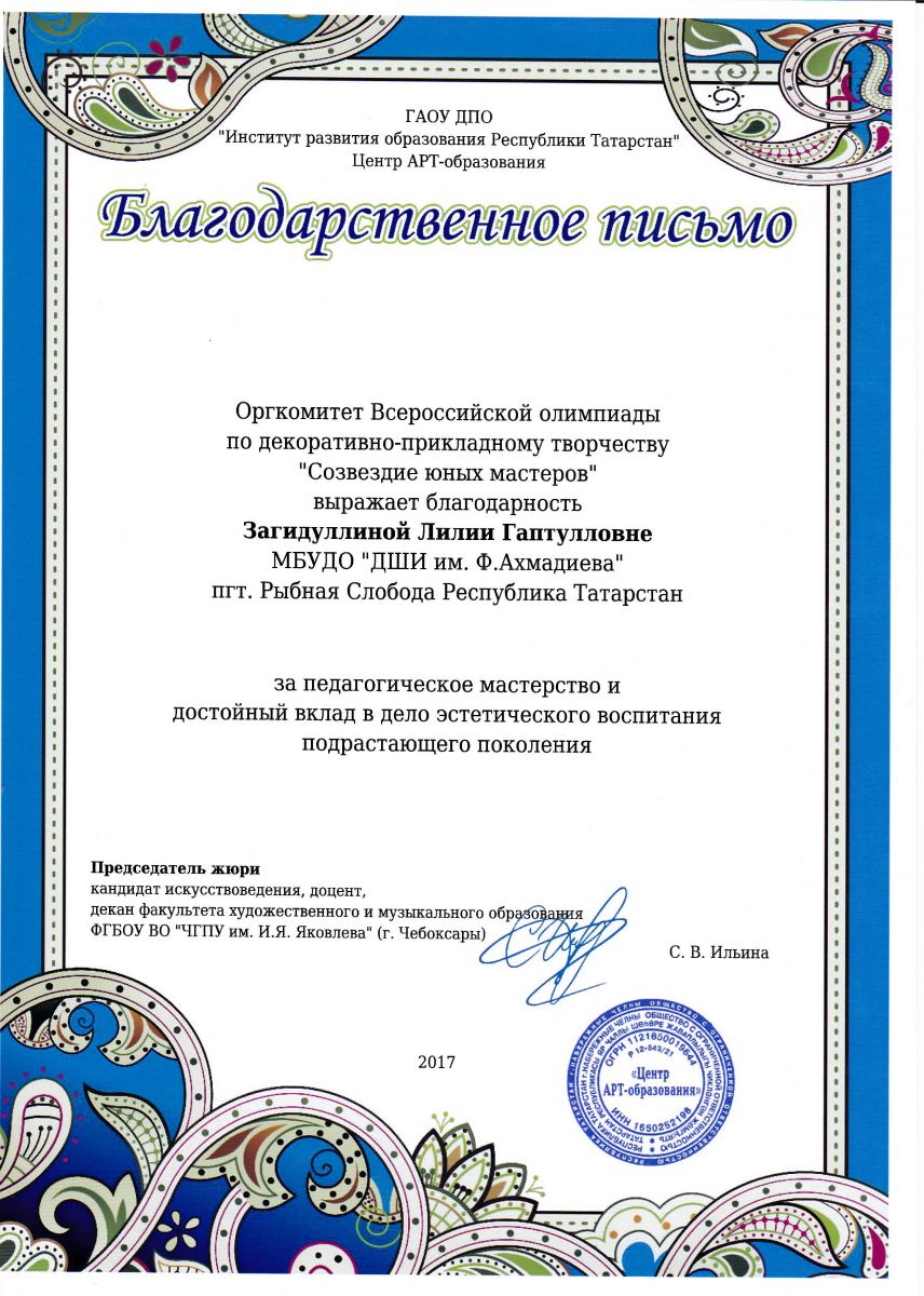 Загидуллина Лилия Гаптулловна - Благодарственное письмо оргкомитета Всерссийской олимпиады по декоративно-прикладному творчеству "Совездие юных мастеров" (март 2017г.)