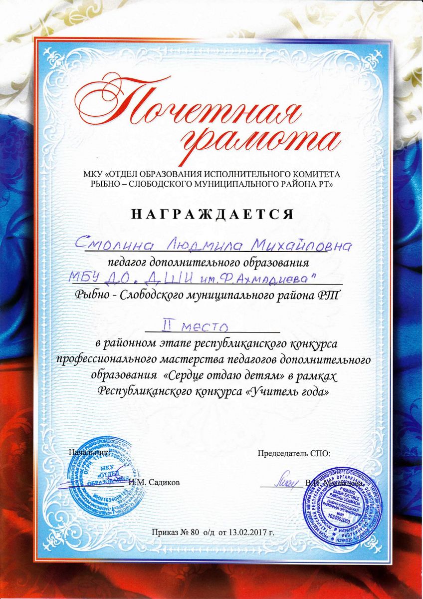 Смолина Людмила Михайловна - Почетная грамота за второе место в муниципальном этапе республиканского конкурса профессионального мастерства педагогов дополнительного образования "Сердце отдаю детям" в рамках республиканского конкурса "Учитель года"