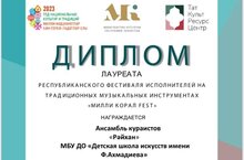 Ансамбль кураистов “Райхан” Детской школы искусств им. Ф.Ахмадиева, под руководством Мубаракшина В.В, стала лауреатом Республиканского фестиваля исполнителей на традиционных музыкальных инструментах “Милли корал FEST”. Поздравляем ребят с заслуженной победой и желаем коллективу новых успехов в дальнейшем творческом пути!