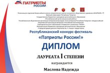 с 1 по 3 ноября текущего года, в Казани, проходил Республиканский конкурс-фестиваль "Патриоты России!". Лауреатом I степени, в номинации: "Художественное слово" (видеоклип), стала учащаяся отделения театрального искусства Маслова Надежда (руководитель Банницын В.В.) Поздравляем Надежду с достойной победой!