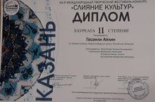 25 октября в Казани прошел 44 Международный творческий фестиваль-конкурс "СЛИЯНИЕ КУЛЬТУР". Этот фестиваль проводится при информационной поддержке Министерства культуры Российской Федерации. В номинации: "Дошкольная возрастная группа. Вокал.Соло" Дипломом Лауреата II степени награждена воспитанница преподавателя Перелётовой Т.Г. - Айлин Гасанли. Поздравляем с победой!