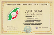 Молодец, Настя! 12.05.2014 Завершился IV Республиканский конкурс детского рисунка и плаката, посвященного 9 мая - Дню Победы, организованном Федерацией профсоюзов Республики Татарстан. Наша Анастасия Ляпахина принимавшая участие в этом конкурсе стала призером заняв II место в номинации: "Профессионалы". Поздравляем!