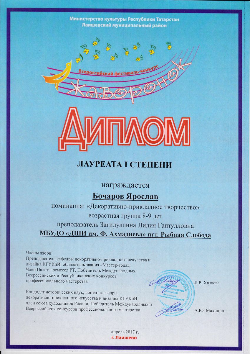 Бочаров Ярослав - Диплом лауреата I-й степени Всероссийского фестиваля-конкурса "Жаворонок" в номинации "Декоративно-прикладное творчество" (возрастная группа 8-9 лет)(апрель 2017г.)