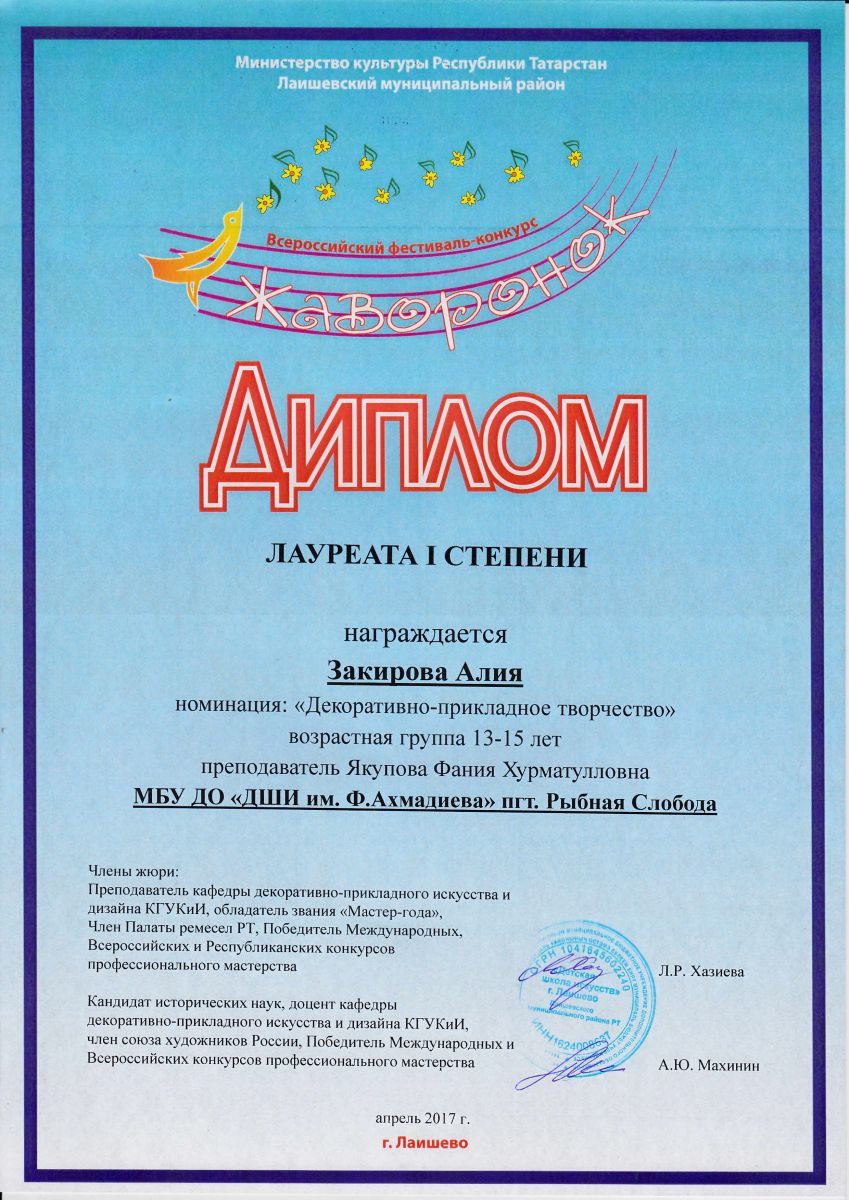 Закирова Алия - Диплом лауреата I-й степени Всероссийского фестиваля-конкурса "Жаворонок" в номинации "Декоративно-прикладное творчество" (возрастная группа 13-15 лет)(апрель 2017г.)