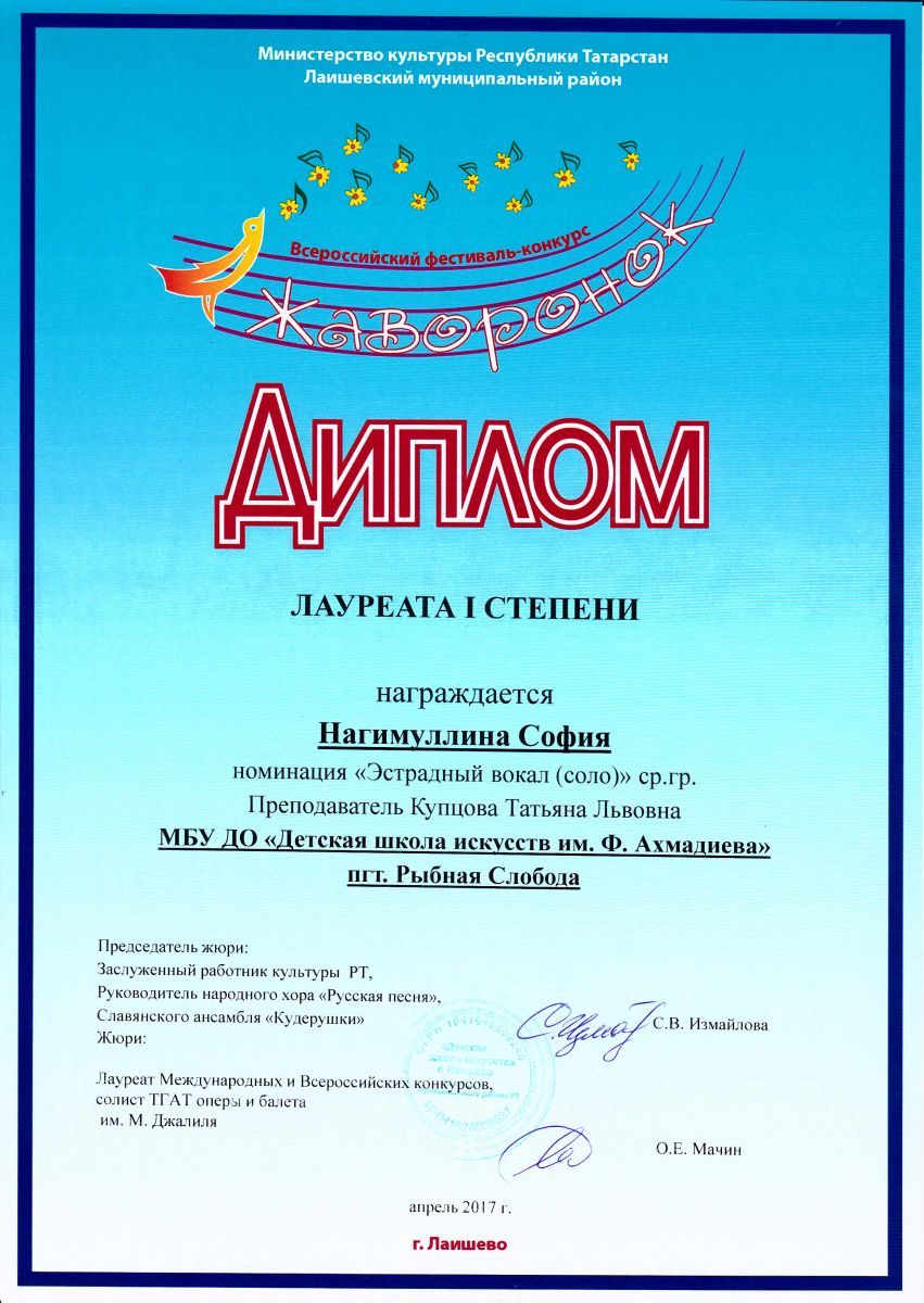 София Нагимуллина - Диплом лауреата I-й степени Всероссийского фестиваля-конкурса "Жаворонок" в номинации "Эстрадный вокал (соло)" (средняя группа )(апрель 2017г.)