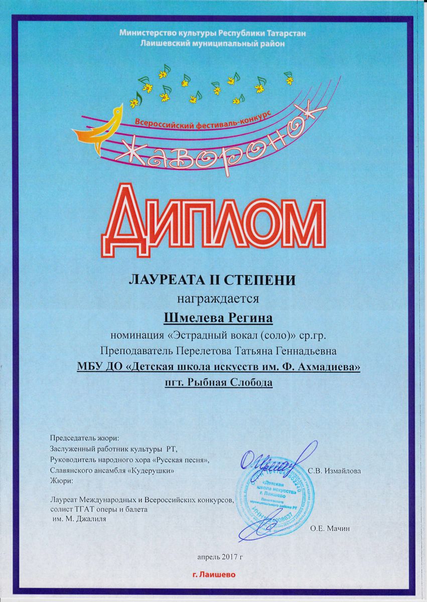 Регина Шмелева - Диплом лауреата II-й степени Всероссийского фестиваля-конкурса "Жаворонок" в номинации "Эстрадный вокал (соло)" (средняя группа )(апрель 2017г.)