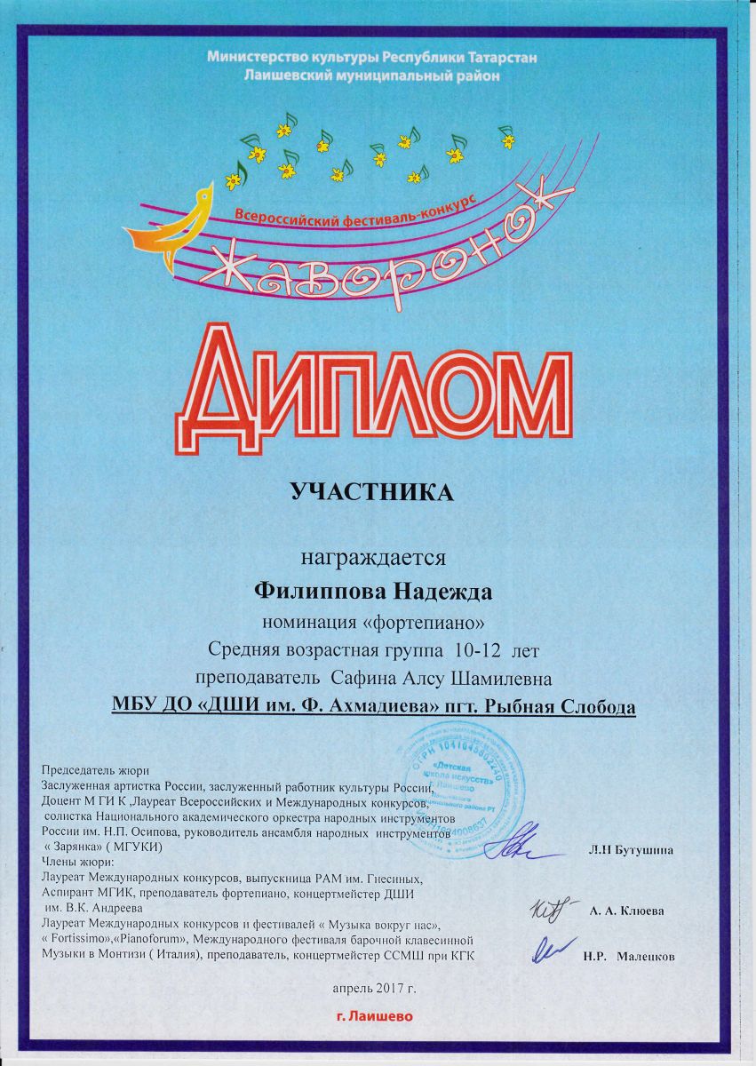 Надежда Филлипова - Диплом участника Всероссийского фестиваля-конкурса "Жаворонок" в номинации "Фортепиано" (средняя возрастная группа 10-12 лет)(апрель 2017г.)