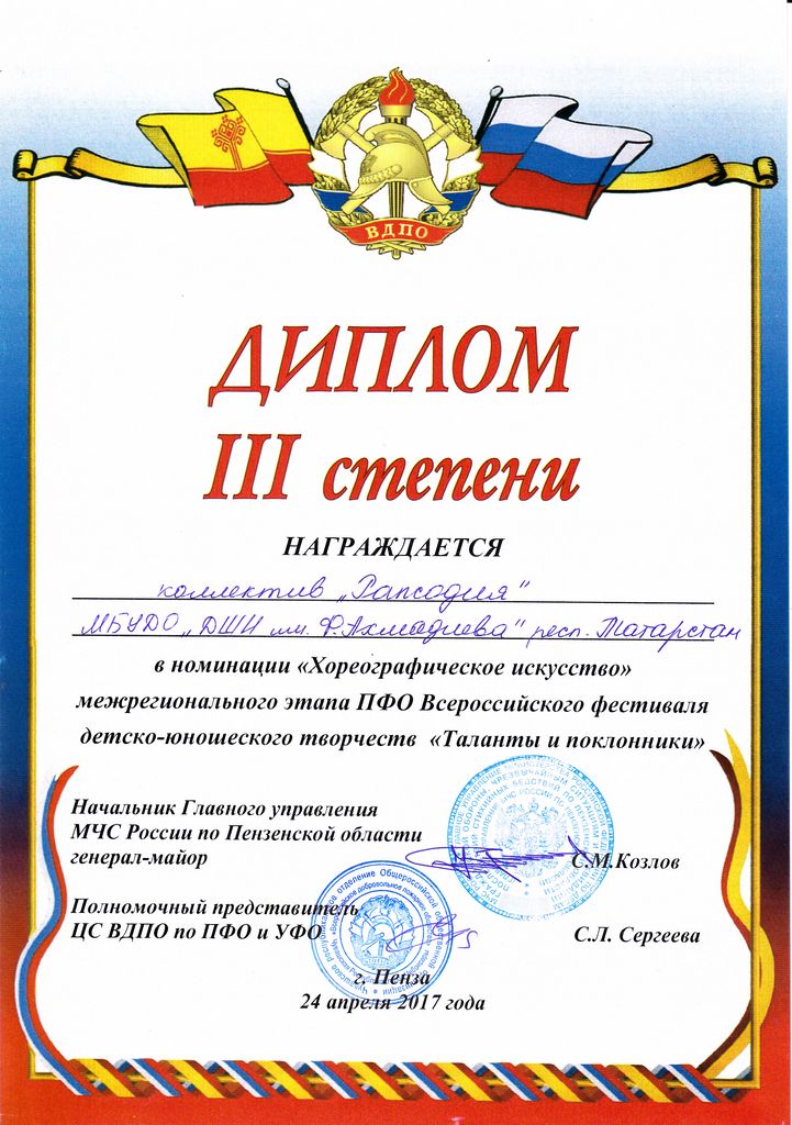 Хореографический коллектив "Рапсодия" - Диплом за III-й степени Всероссийского фестиваля детско-юношеского творчества "Таланты и поклонники" в номинации "Хореографическое искусство" (май 2017г.)
