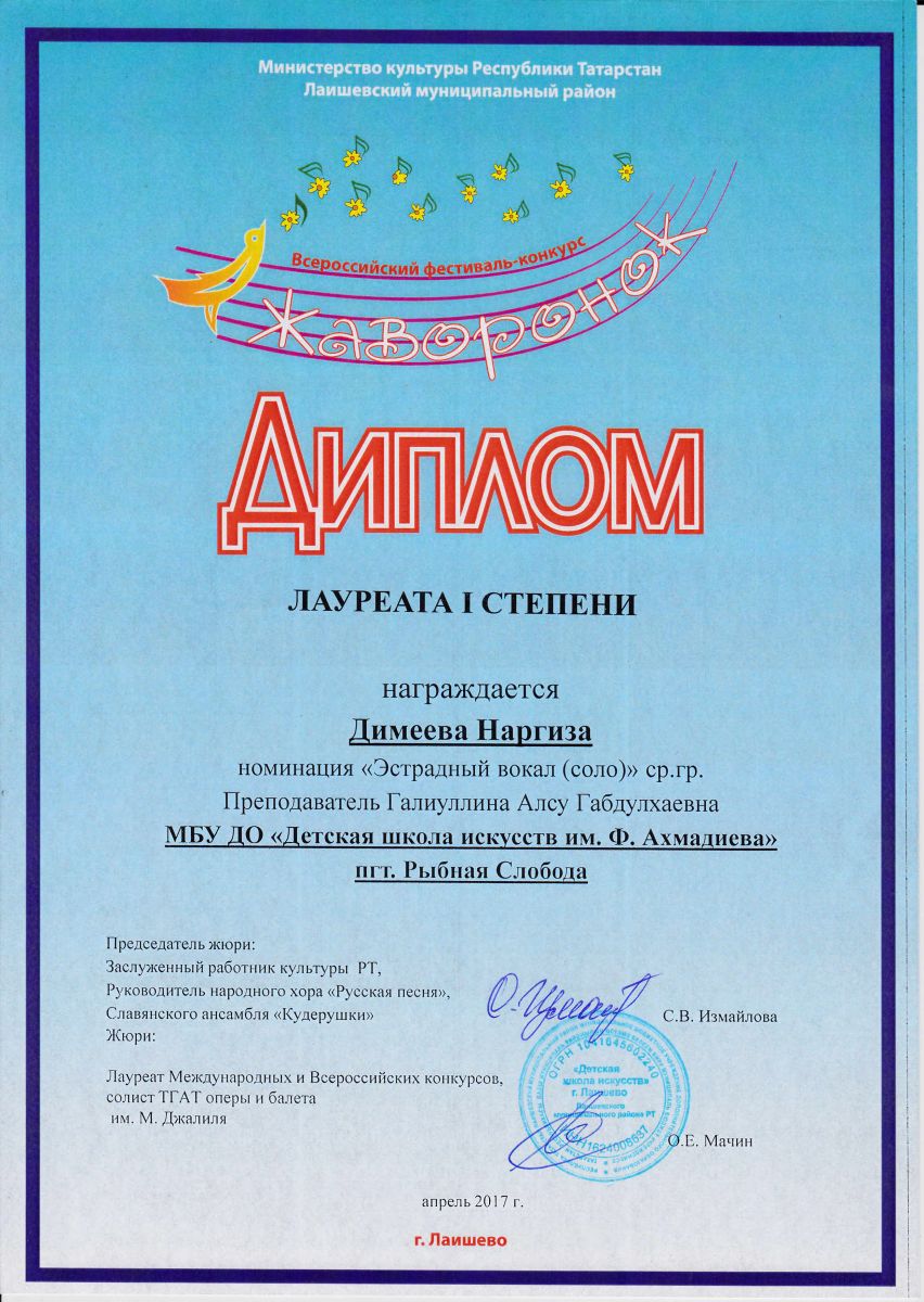 Наргиза Димеева - Диплом лауреата I-й степени Всероссийского фестиваля-конкурса "Жаворонок" в номинации "Эстрадный вокал (соло)" (средняя группа )(апрель 2017г.)