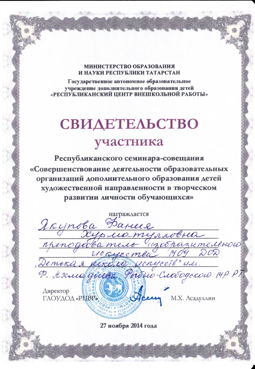 - Свидетельство участника Республиканского семинара-совещания "Совершенствование деятельности образовательных организаций дополнительного образования детей художественной направленности в творческом развитии личности обучающихся" (2014г.)