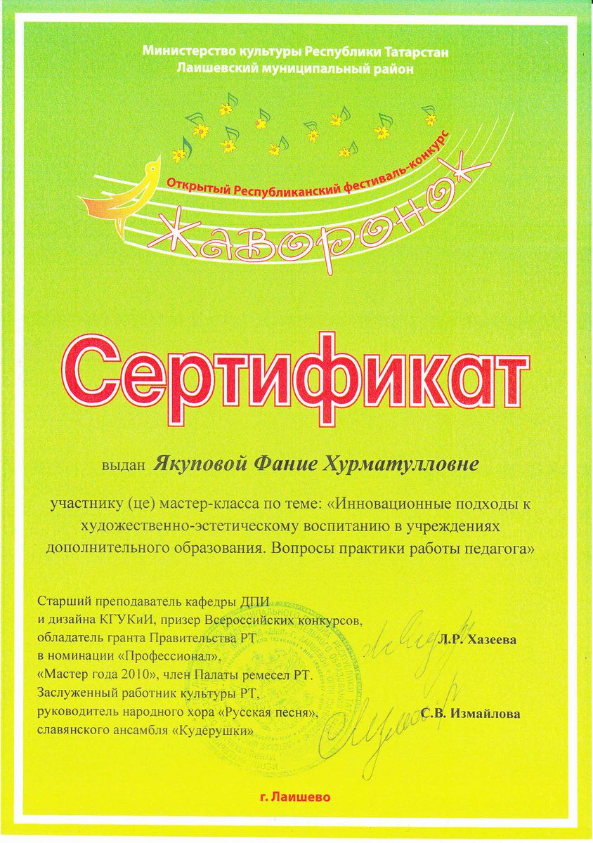 - Якупова Фания Хурматулоовна - Сертификат участника мастер-класса по теме: "Инновационные подходы к художественно-эсетическому воспитанию в учреждениях дополнительного образования. Вопросы практики работы педагога" (2015г.)