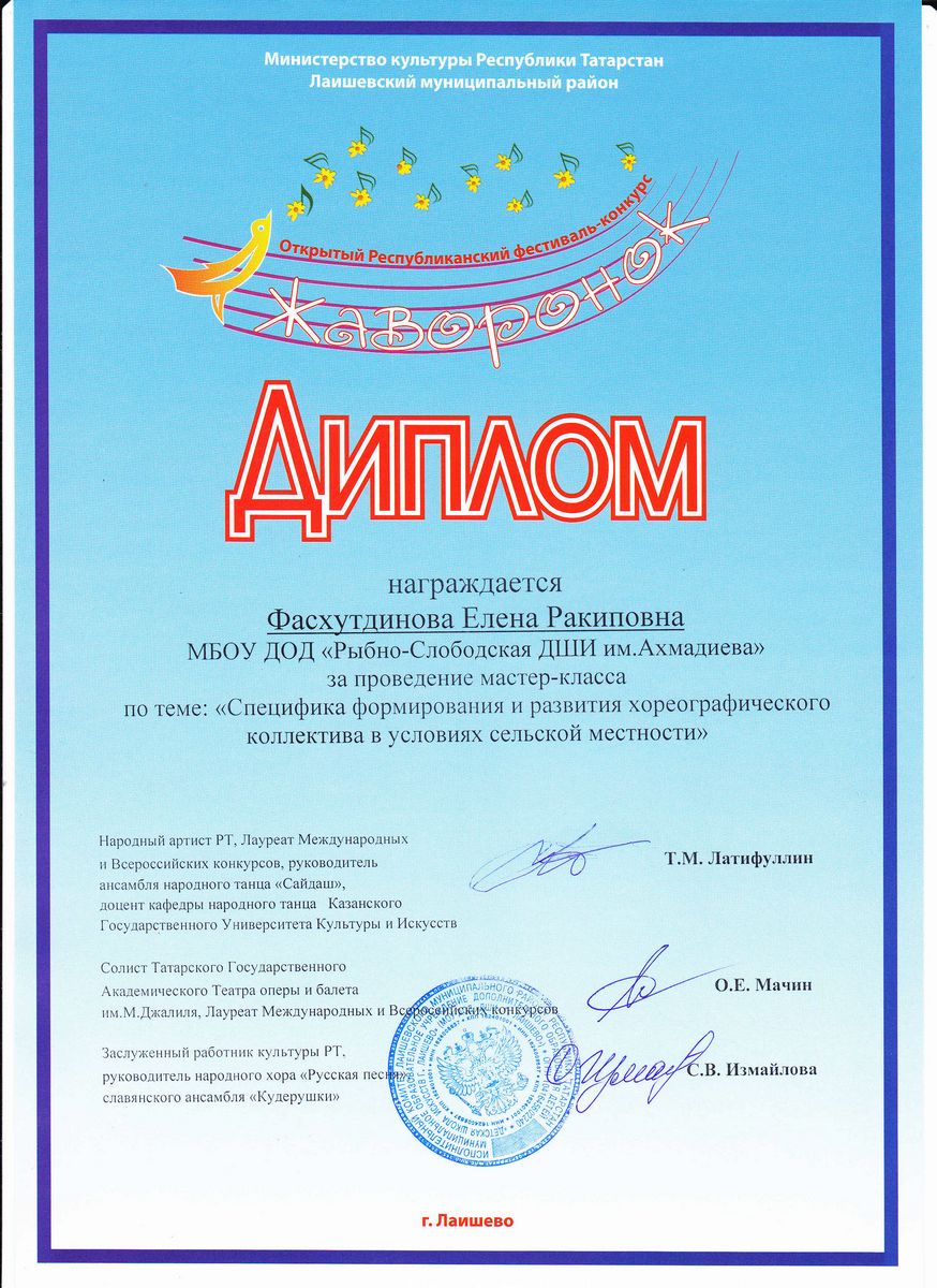 Фасхутдинова Елена Ракиповна - Диплом за проведение мастер-класса по теме: "Специфика формирования и развития хореографического коллектива в условиях сельской местности" в рамках Открытого Республиканского фестиваля-конкурса "Жаворонок" (2015г.)