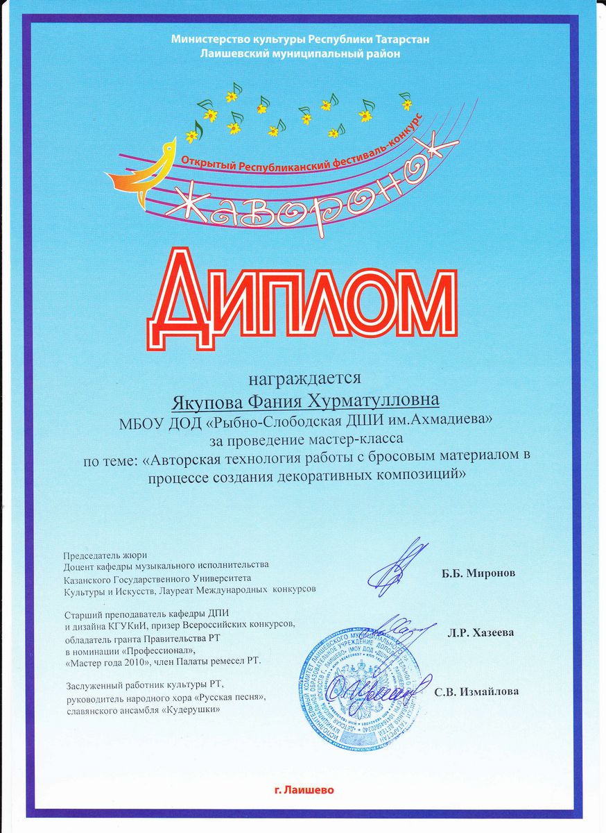 - Якупова Фания Хурматулловна - Диплом за проведение мастер-класса по теме: "Авторская технология работы с бросовым материалом в процессе создания декоративных композиций" в рамках Открытого Республиканского фестиваля-конкурса "Жаворонок" (2015г.)