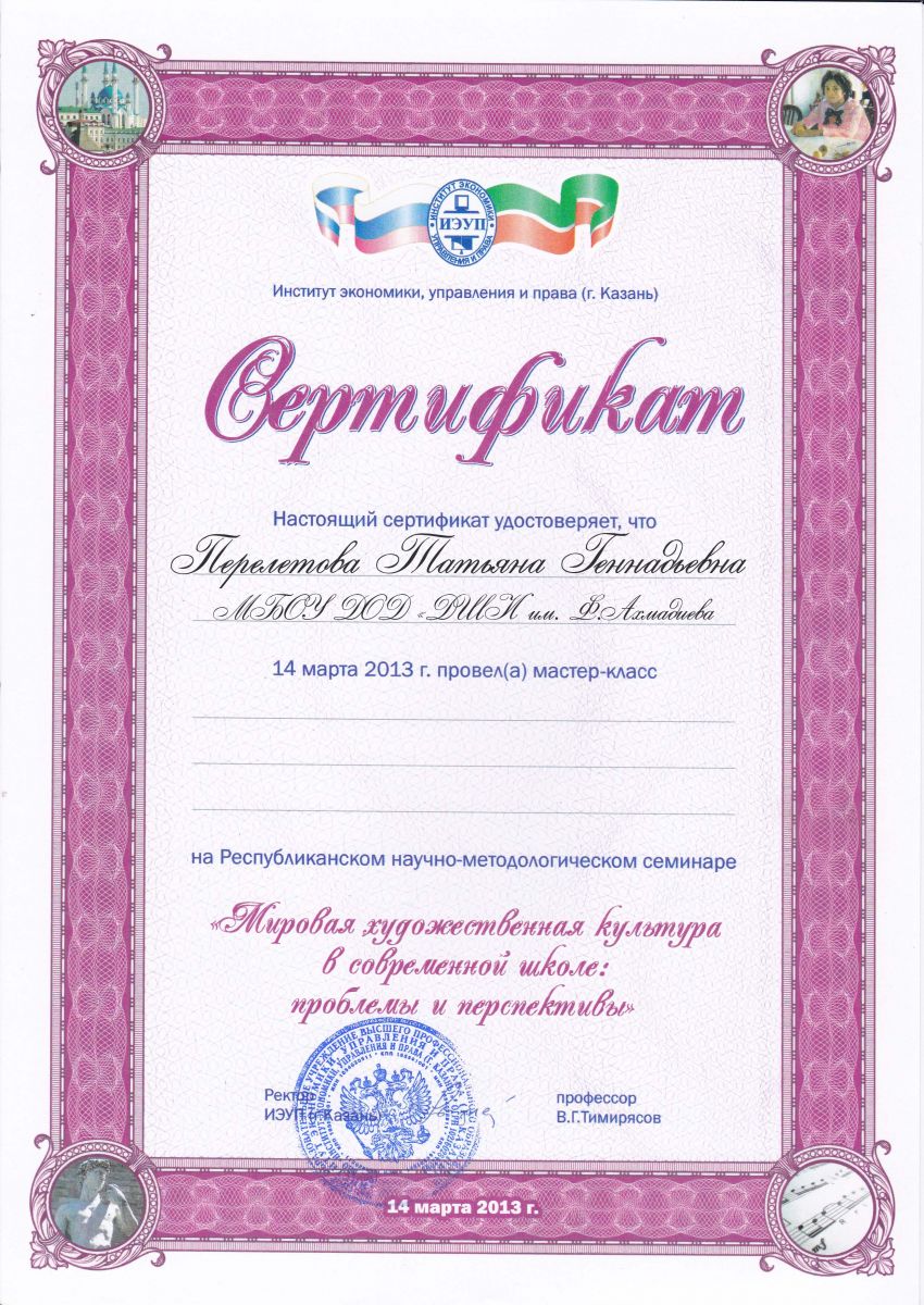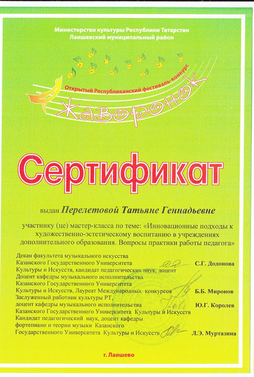 - Перелетова Татьяна Геннадьевна - Сертификат участника мастер-класса по теме: "Инновационные подходы к художественно-эсетическому воспитанию в учреждениях дополнительного образования. Вопросы практики работы педагога" (2015г.)