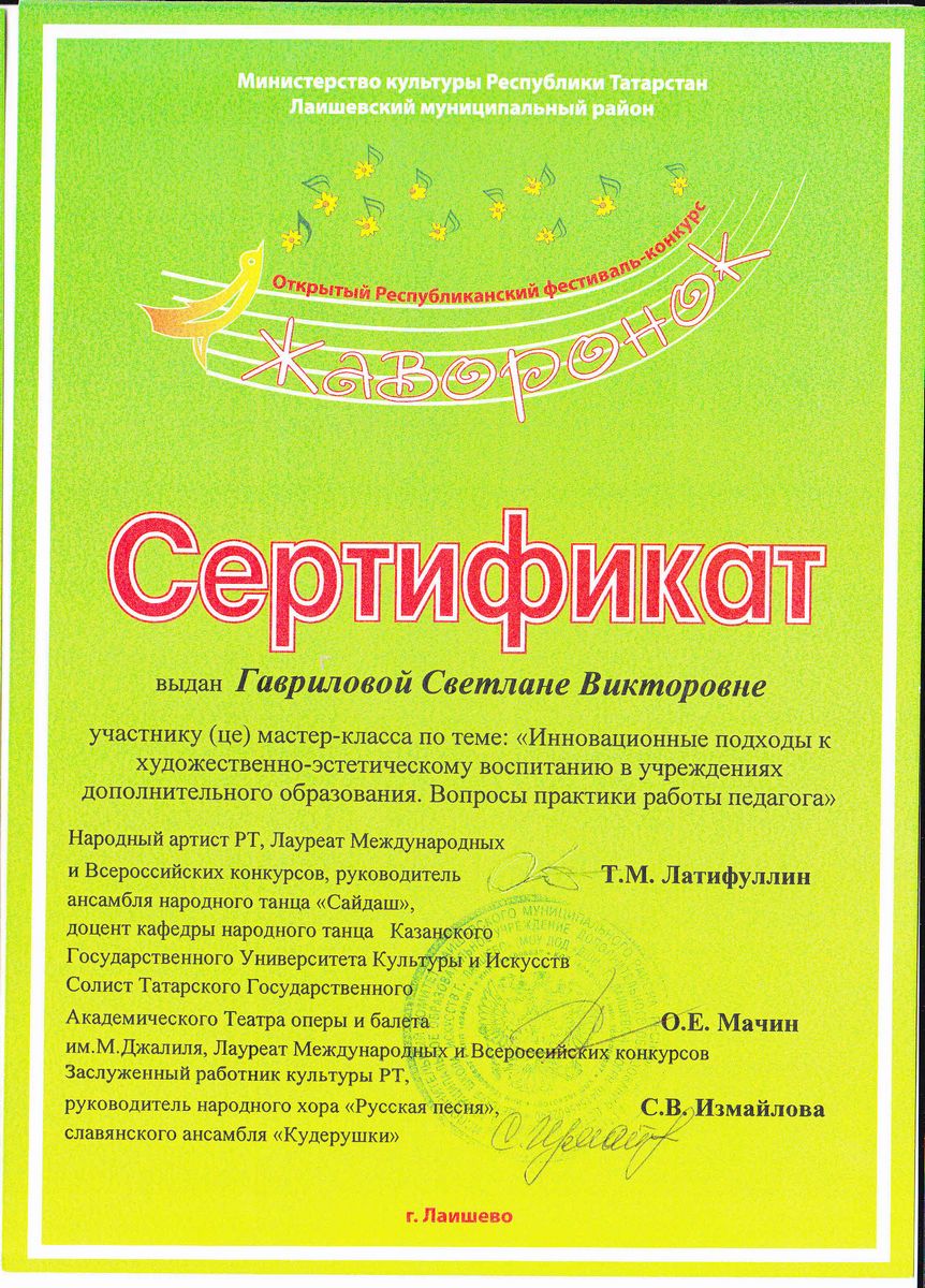 - Гаврилова Светлана Викторовна - Сертификат участника мастер-класса по теме: "Инновационные подходы к художественно-эсетическому воспитанию в учреждениях дополнительного образования. Вопросы практики работы педагога" (2015г.)