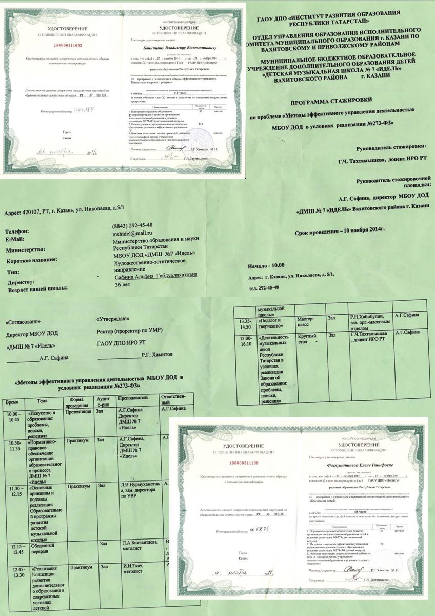 - Курсы повышения квалификации (ИРО РТ) по программе "Современные методики обучения игре на фортепиано в ДМШ" (2014г.)