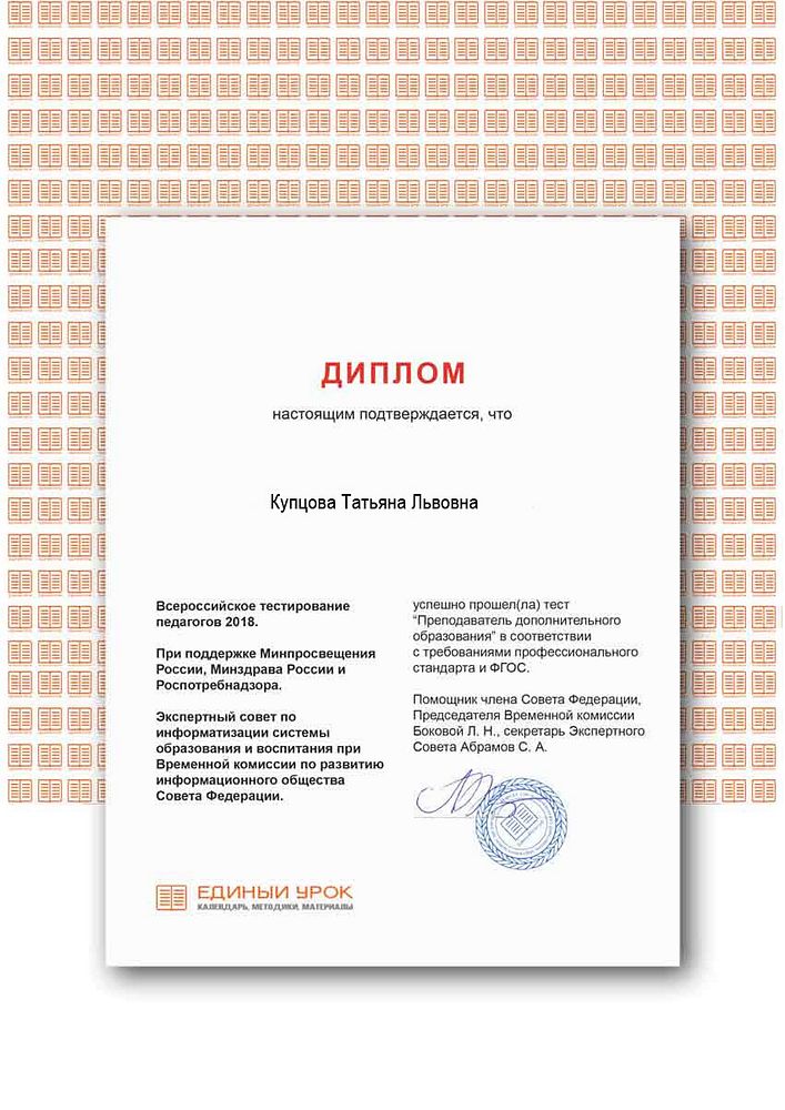 - Купцова Татьяна Львовна - Диплом об успешном прохождении Всероссийского тестирования педагогов 2018