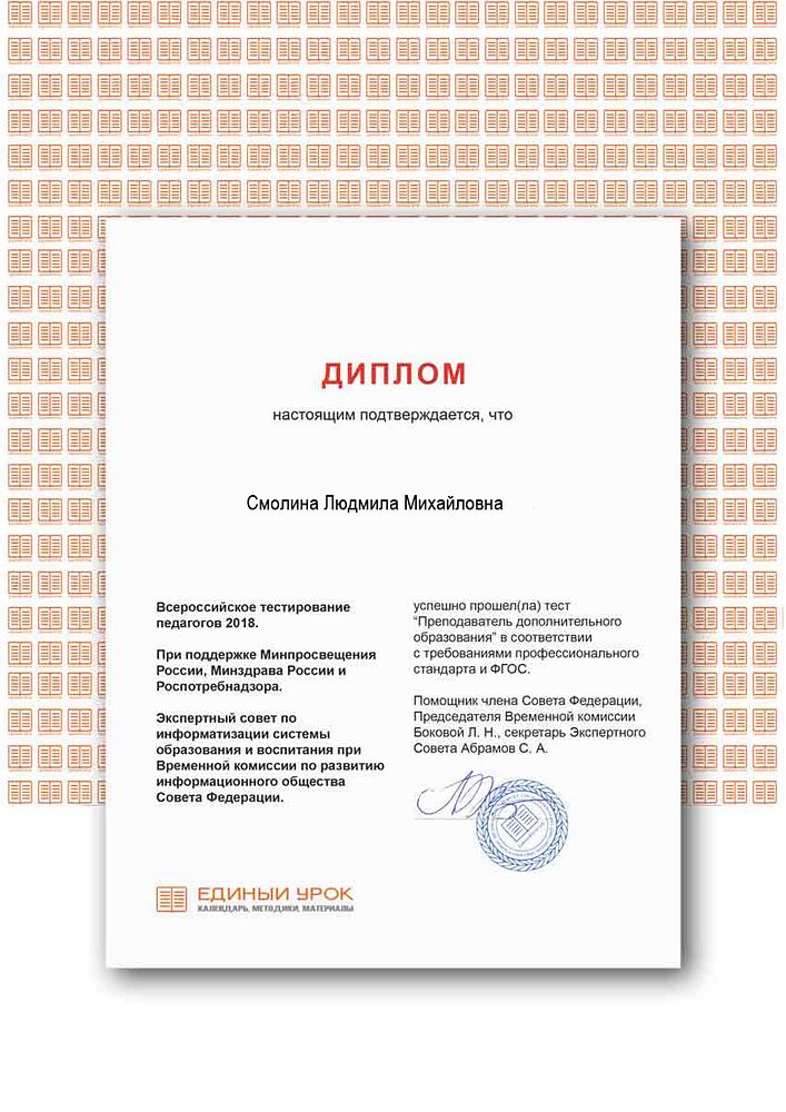 - Смолина Людмила Михайловна - Диплом об успешном прохождении Всероссийского тестирования педагогов 2018