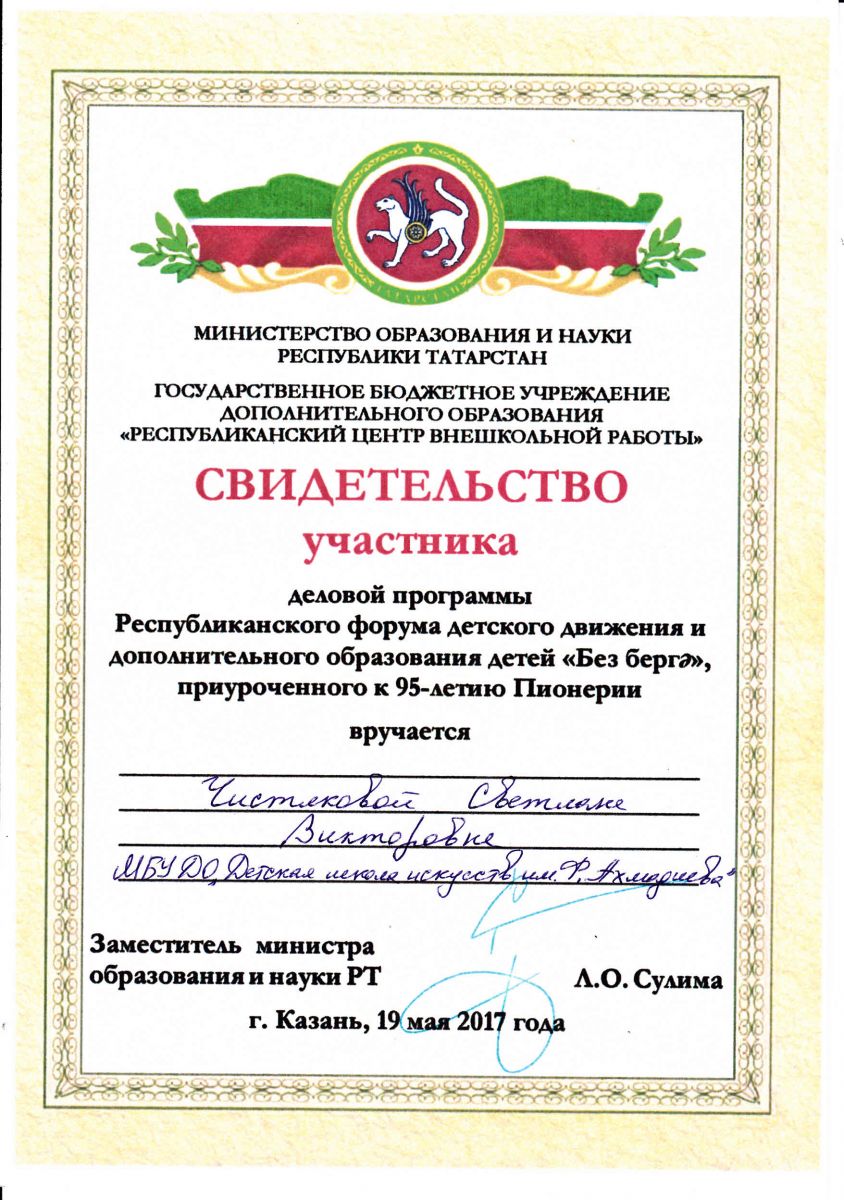 - Чистякова Светлана Викторовна - Свидетельство участника деловой программы Республиканского форума детского движения и дополнительного образования детей "Без берге" приуроченного к 95-летию Пионерии