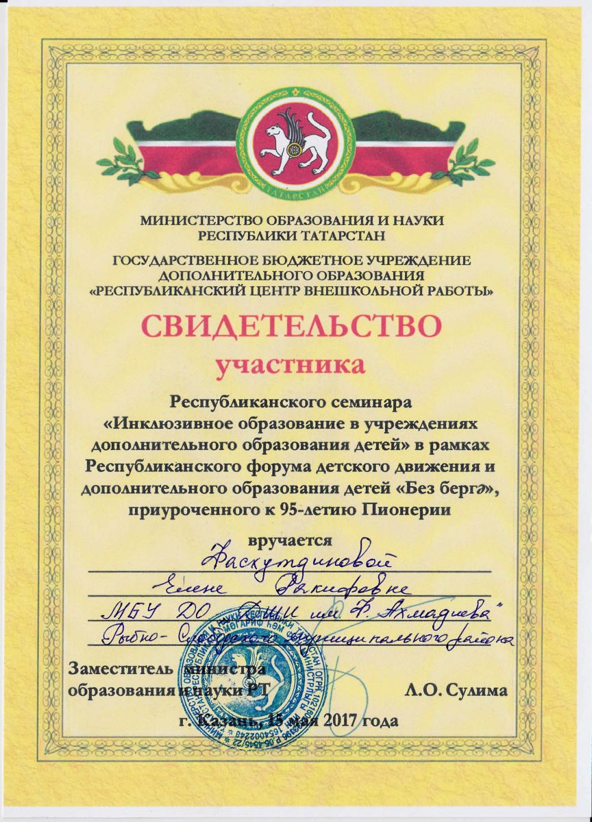 Фасхутдинова Елена Ракифовна - Сертификат участника Республиканского семинара "Инклюзивное образование в учреждениях дополнительного образования детей" в рамках Республиканского форума детского движения дополнительного образования детей "Без берге", приуроченного к 95-летию пионерии (май 2017г.)