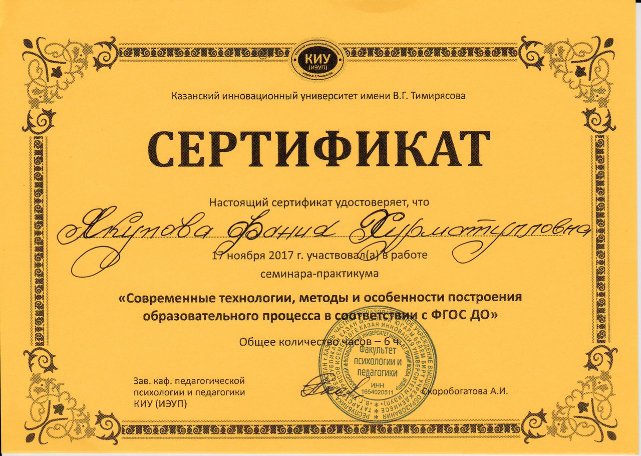 Якупова Фания Хурматулловна - Сертификат участника семинара-практикума "Современные технолиги, методы и особенности построения образовательного процесса в соответствии с ФГОС ДО"(ноябрь 2017г.)