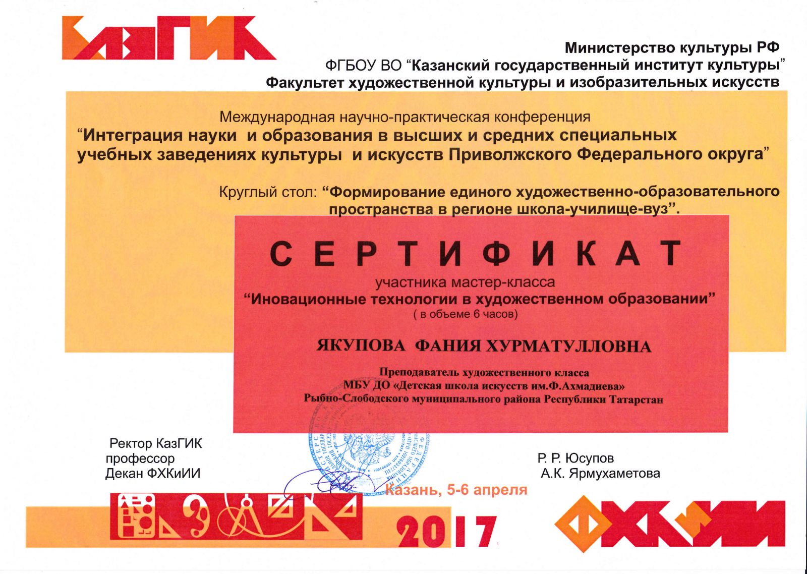 - Якупова Фания Хурматулловна - Сертификат участника мастер-класса "Инновационные технологии в художественном образовании" в рамках Медународной научно-практической конференции (апрель 2017г.)